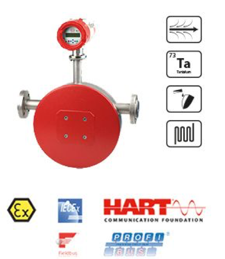 Coriolis Flowmeters with pure tantalum measuring tubes manufactured by Heinrichs. |